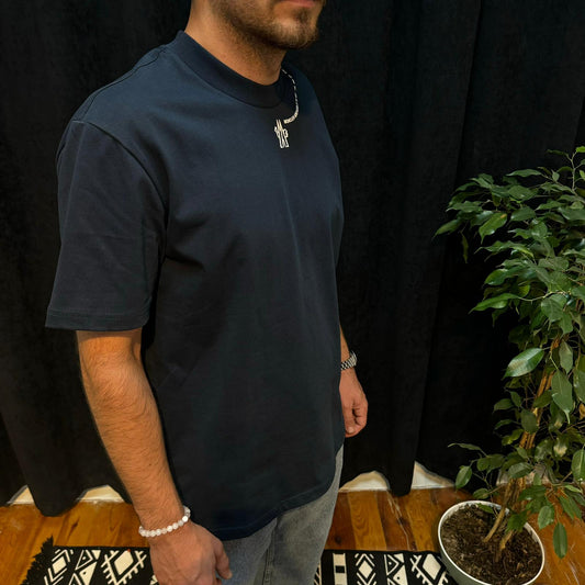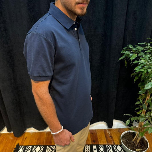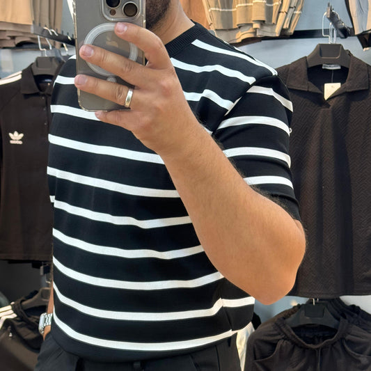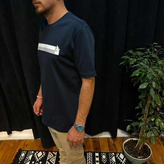 Yatay Beyaz Çizgili Yakalı Triko Tişört Lacivert
