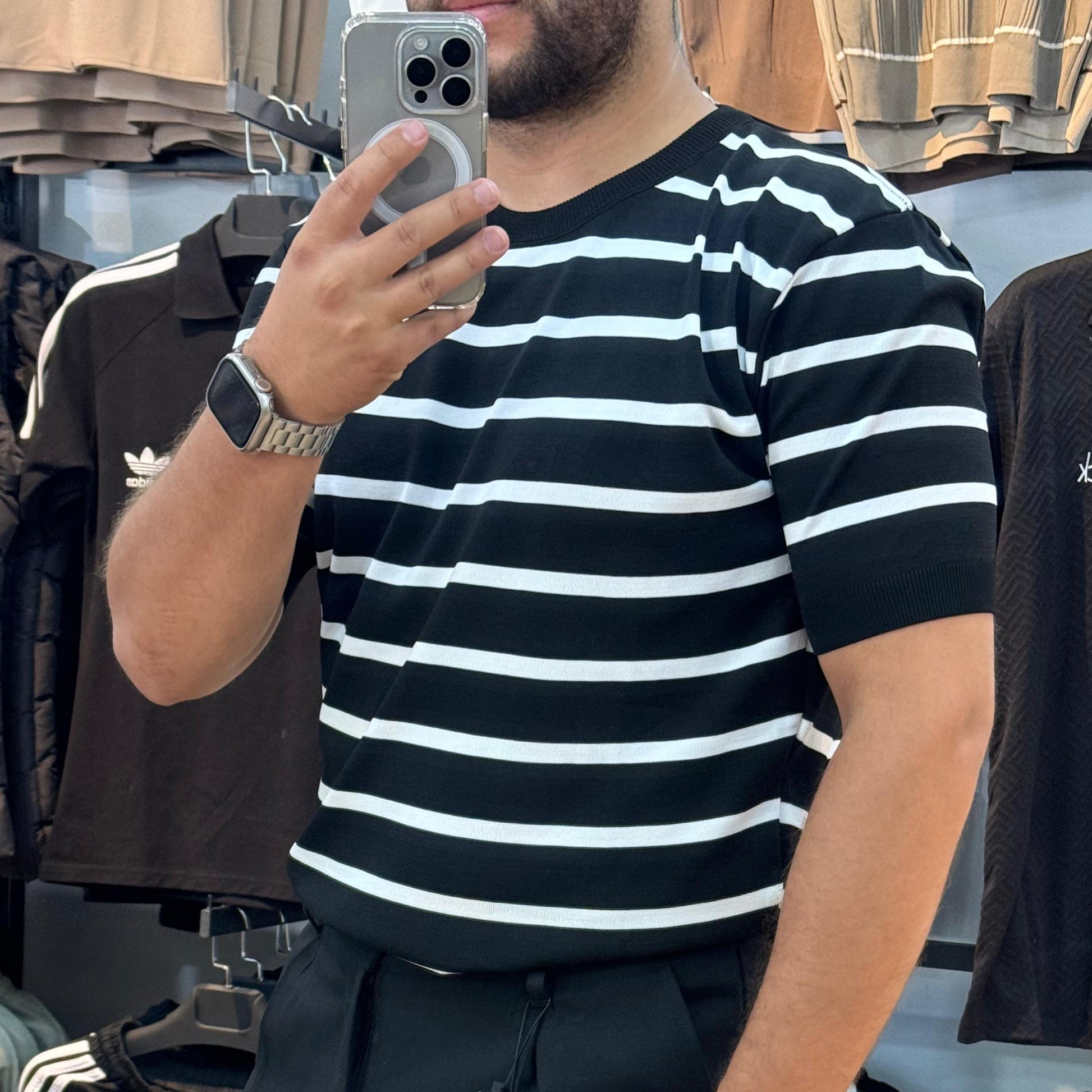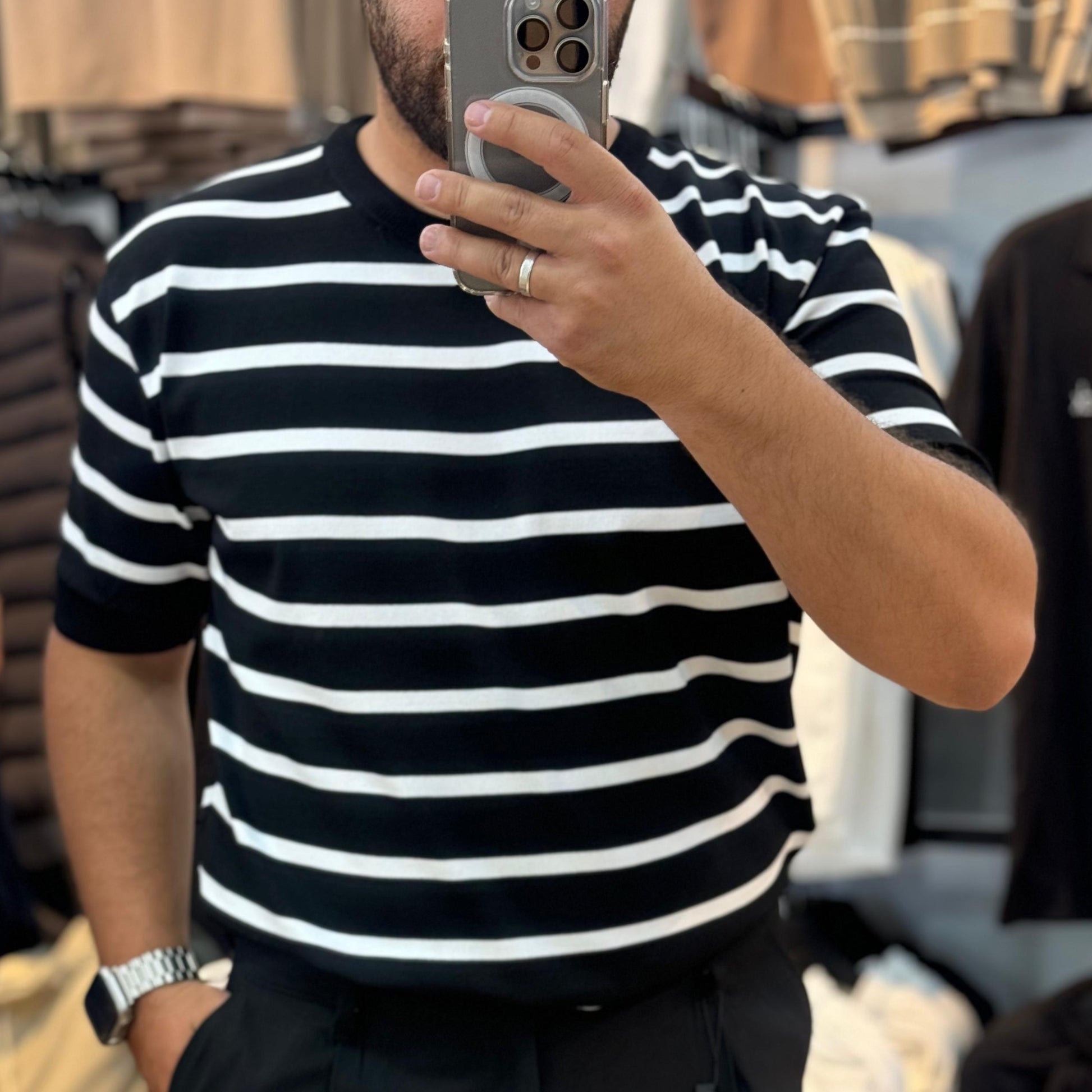 Yatay Beyaz Çizgili Yakalı Triko Tişört Lacivert